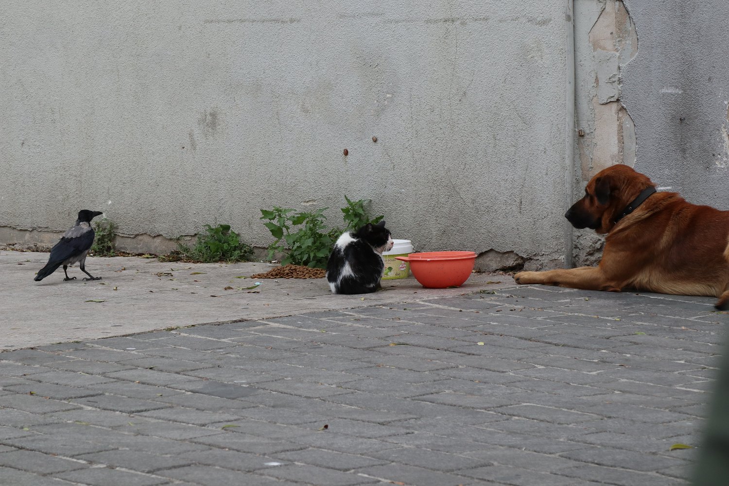 While the dog didn't have any issue with the cat, he didn't want the food stolen by the crow. The cat never saw the crow.